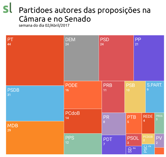 O partido que liderou a produção de novas proposições foi o PT que apresentou 44 proposições, seguido do PSDB com 31. Em terceiro está o MDB com 29 matérias.