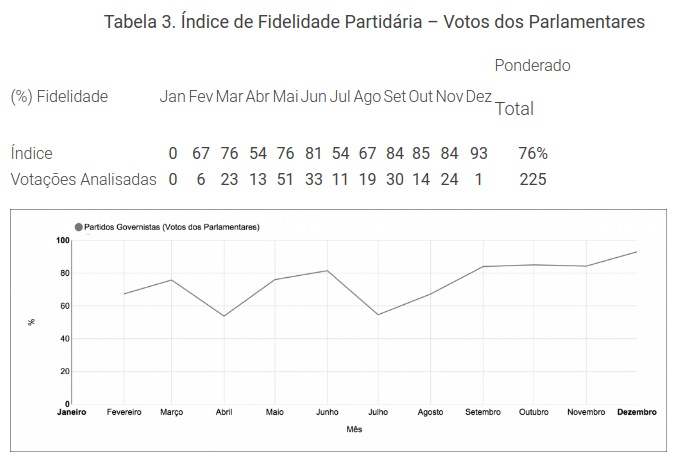 O objetivo deste indicador é medir a fidelidade (dos partidos e seus parlamentares que pertencem a “Base Governista”) às orientações do governo nas votações em plenário na Câmara dos Deputados. Através dele é possível obter insights relevantes sobre a articulação e efetividade do Governo Federal no controle da “Base Governista” e criar uma referência para a posterior aferição de impactos externos, isto é, fatores como mídia, pressão popular, stakeholders, redes sociais, etc.