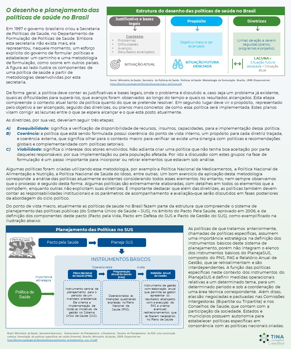 Neste sentido, a formulação de uma política deve contar com definições precisas de seus objetivos, dos elementos operacionais (instrumentos), diretrizes e arranjos institucionais. Ao final deste artigo apresentamos o desenho das políticas de saúde no Brasil e ferramentas de planejamento no Sistema Único de Saúde, a fim de promover um exemplo claro dos instrumentos da política de saúde no país.