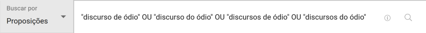 Como a expressão pode ser escrita de diversas formas, para atingir o objetivo Critério 1 inseri quatro palavras-chave alternativas na barra de pesquisa para atingir o objetivo (“discurso de ódio”, “discursos de ódio”, “discurso do ódio” e “discursos do ódio”), ligadas pela conjunção OU. De acordo com o suporte da Sigalei: “Ao acrescentar OU entre duas palavras-chave na sua busca, o mecanismo irá encontrar e entregar resultados com pelo menos um dos termos, ampliando os dados obtidos na pesquisa”.