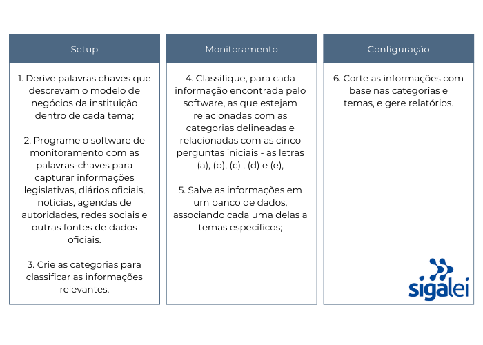 A prioridade é identificar os principais movimentos que ocorrem dentro de cada tema de interesse da organização – um projeto de lei que altera o marco regulatório, por exemplo.