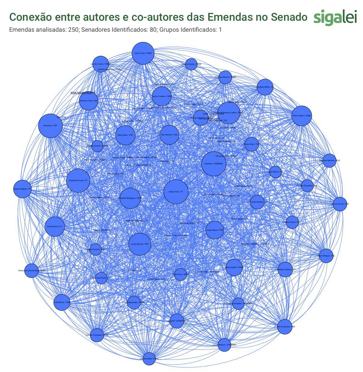 Analisando as emendas apresentadas por mais de um Senador, pelo menos 80 senadores assinaram pelo menos 1 emenda em conjunto. A Rede de coautoria do senado é bastante conectada e densa, o que mostra uma intensa troca assinaturas. Usando algoritmo de clusterização, identificamos apenas 1 grande grupo.