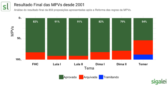 Analisando o gráfico acima, considerando as MPs a partir de 2001, percebemos que as Medidas Provisórias possuem uma grande taxa de aprovação pelo congresso. O governo Lula, tanto no primeiro quanto no segundo mandato teve uma aprovação superior a 90%. Durante o governo Dilma II, esta passou por um processo de impeachment, com Temer assumindo a presidência. Apesar de também utilizar Medidas Provisórias o atual presidente é quem tem a maior taxa de MP arquivadas pelo Congresso.