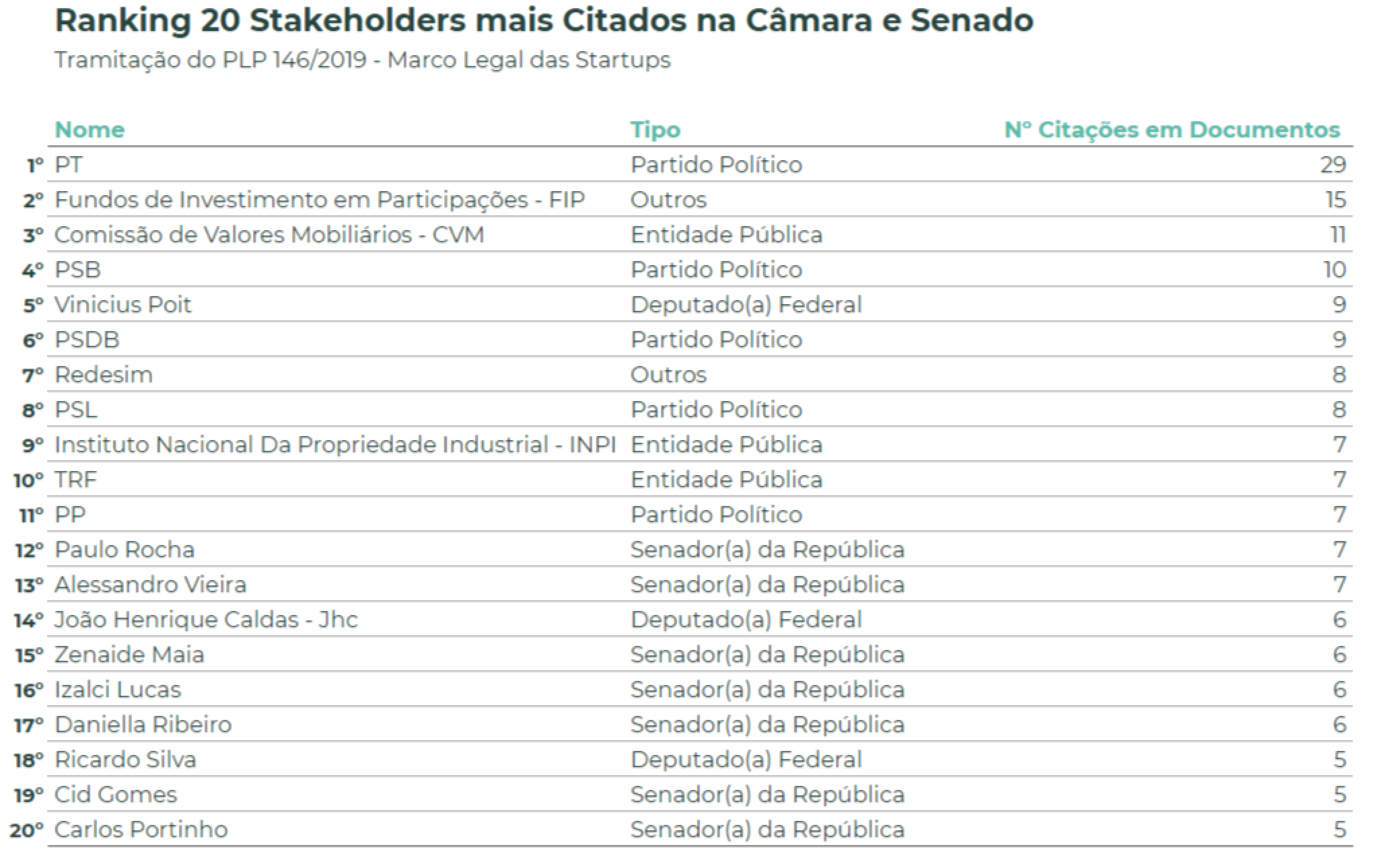 Esse é um indicativo das partes interessadas no ecossistema de startups que não necessariamente são políticos e tomadores de decisão pública, mas, certamente influenciaram o debate em torno do tema. Abaixo mostramos o ranking dos 20 stakeholders mais citados em documentos (seja por ter sido autor ou por ter tido o nome mencionado)
