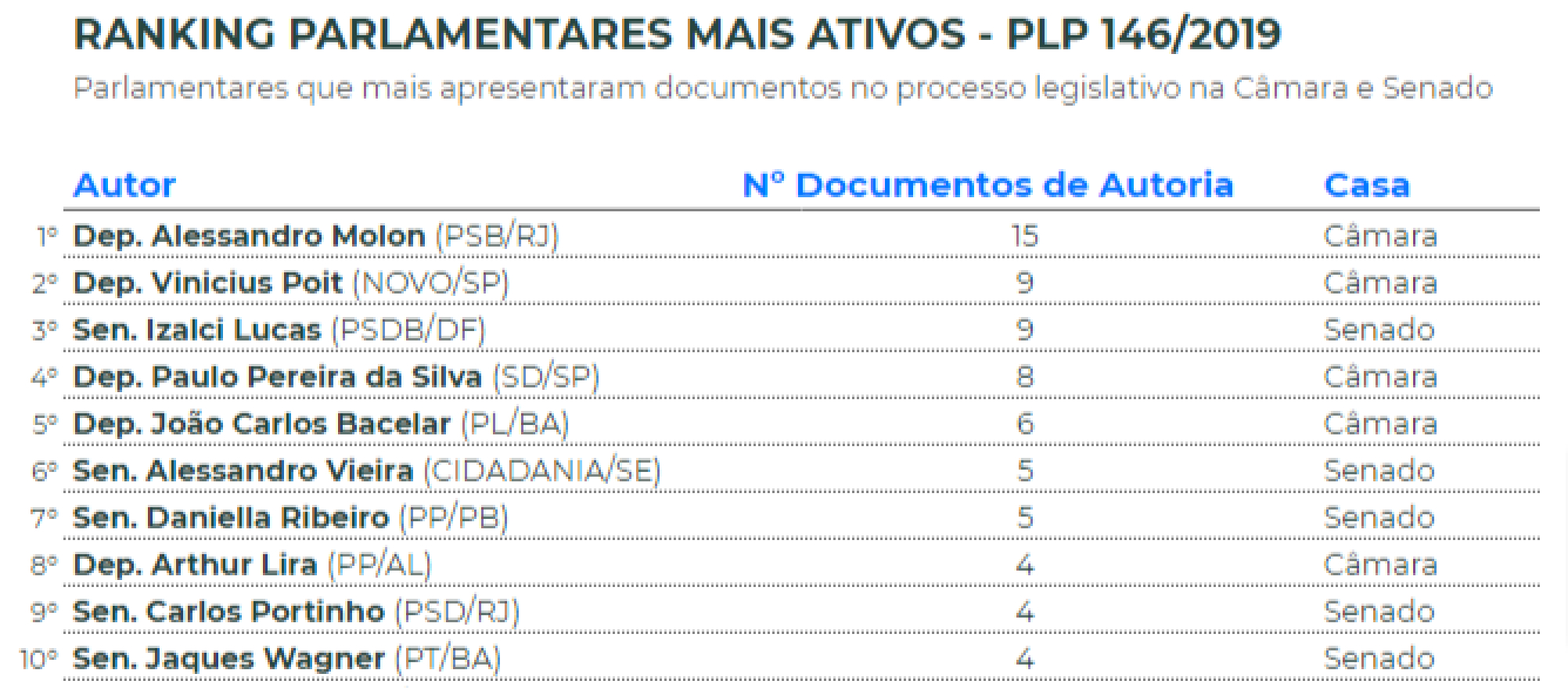 Naturalmente, autores e relatores se destacam, pois seus nomes constam na maior parte dos documentos oficiais como, por exemplo, inteiro teor do texto inicial e pareceres. Neste caso, O relator na Câmara, Dep. Vinicius Poit (NOVO/SP) aparece em 2º no ranking, com autoria de 15 documentos (dentre pareceres, requerimentos e ofícios). O relator do Senado, Sen. Carlos Portinho (PSD/RJ), aparece em 9º, com 4 documentos (pareceres) de sua autoria. Isso demonstra, com dados, a relevância e engajamento do relator da Câmara na articulação dos diversos interesses que envolviam o tema (ele, de fato, encaminhou mudanças ao texto e fomentou o debate).