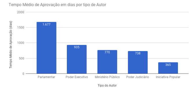 Se o autor for o Poder Executivo, essa média cai para 935 dias, 2,5 anos. Se o autor for o Ministério Público cai para 770 dias, 2,1 anos. Se o autor for o Poder Judiciário a média cai para 738 dias, 2 anos. Já os projetos aprovados provenientes de iniciativa popular demoraram em média 365 dias, ou, 1 ano.